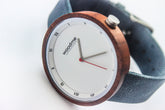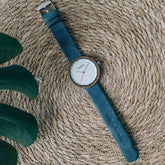 Dette bemærkelsesværdige ur har en omhyggeligt fremstillet urkasse i valnøddetræ parret med en alternativ denimblå læderrem, der legemliggør den fredelige essens af den blide danske brise.