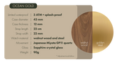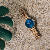 Woodme Ocean Gold er et danskdesignet træur, der sætter standarden for raffinement og stil. Dette udsøgte ur er fremstillet af det fineste gyldne valnøddetræ og har en dyb marineblå urskive og forstærkninger i rustfrit stål.